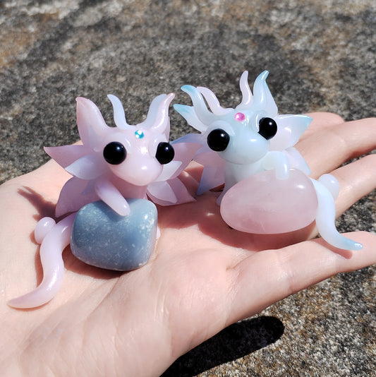 Rose Quartz and Angelite Crystal Dragon Pair