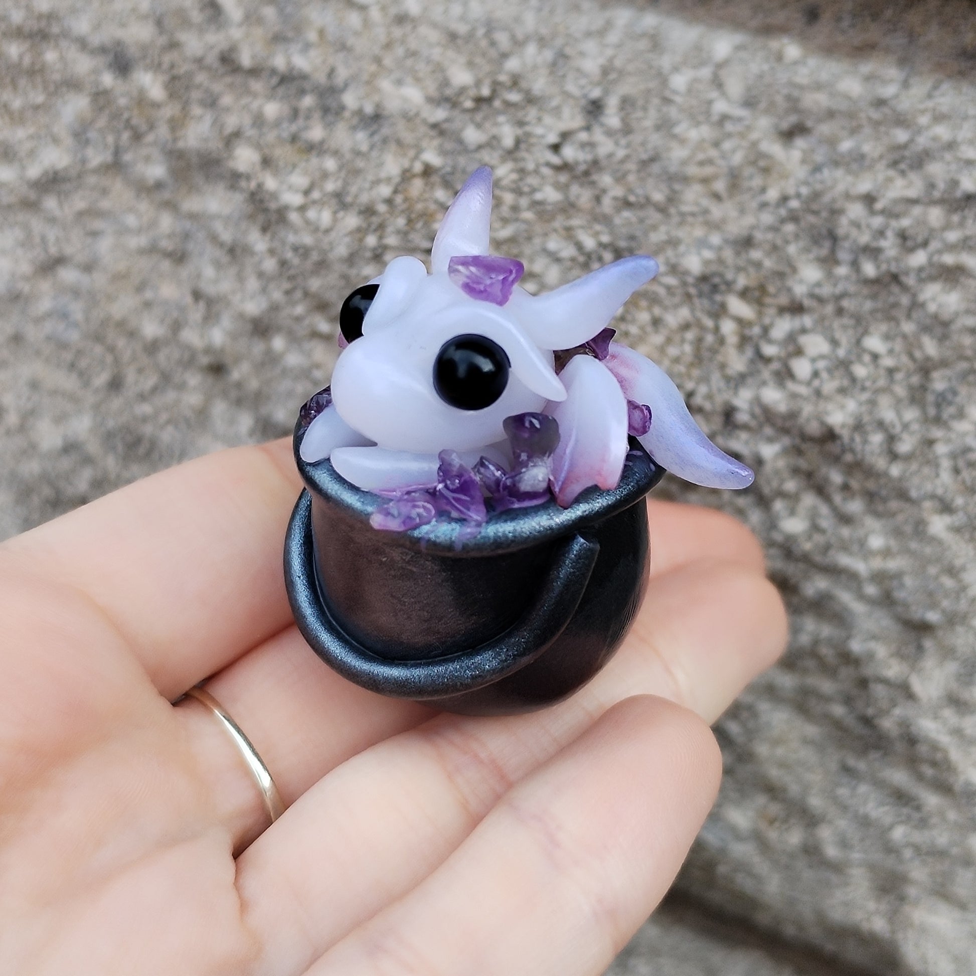 Adorable unique baby dragon carefully handmade from polymer clay sitting inside a cauldron with Amethyst chips.