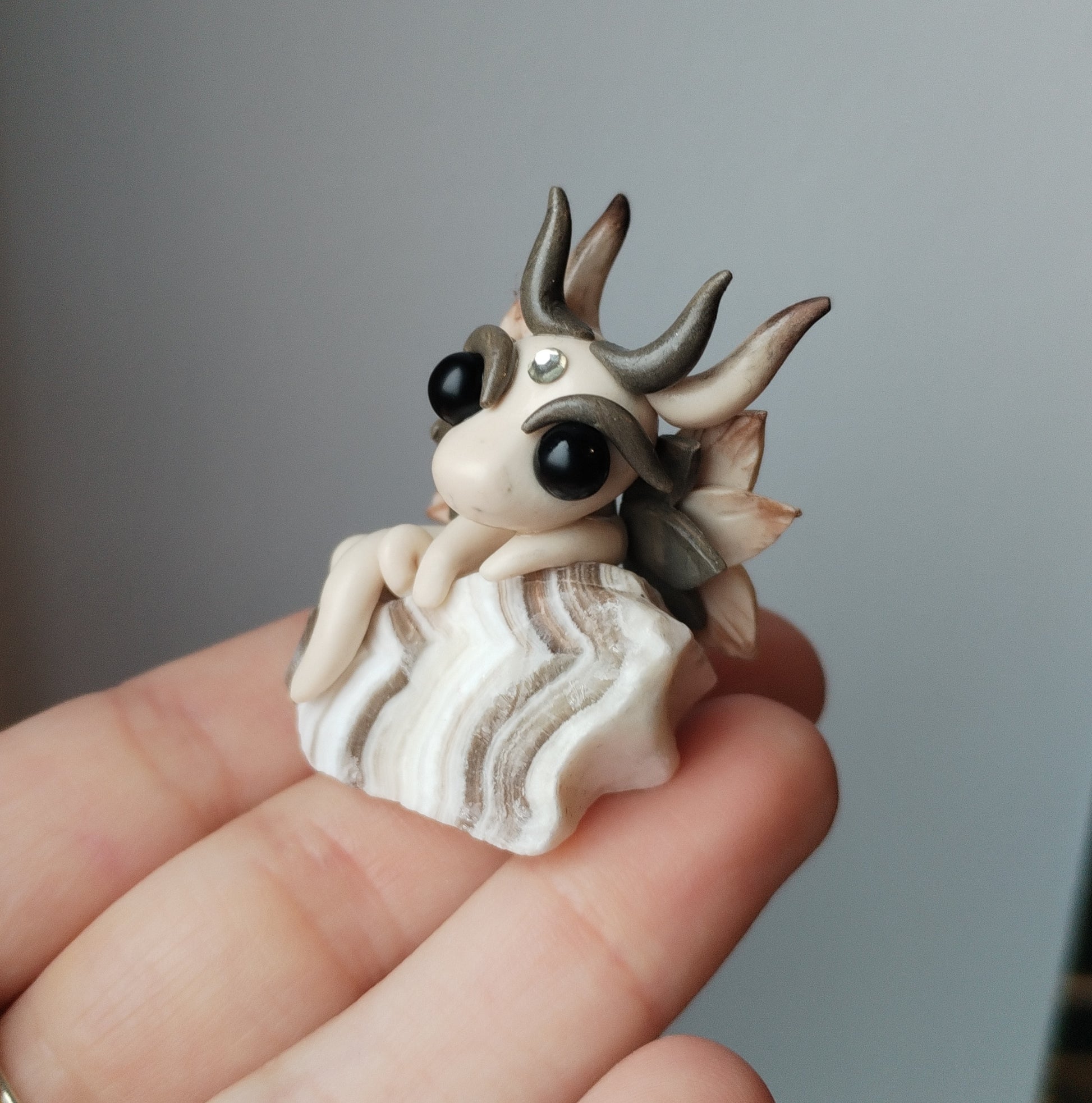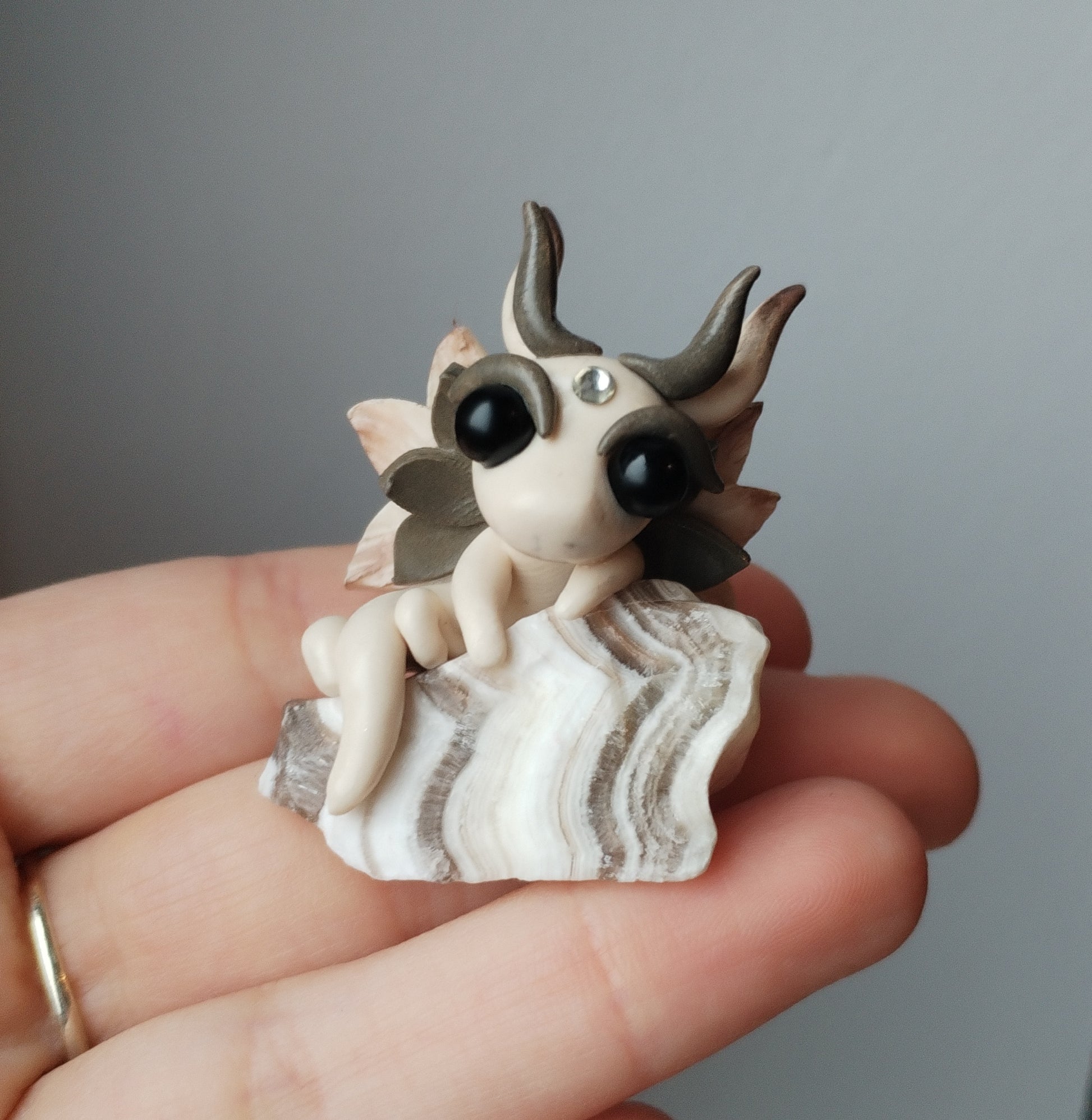 Adorable unique baby dragon carefully handmade from polymer clay on top of a piece of Banded Calicite.