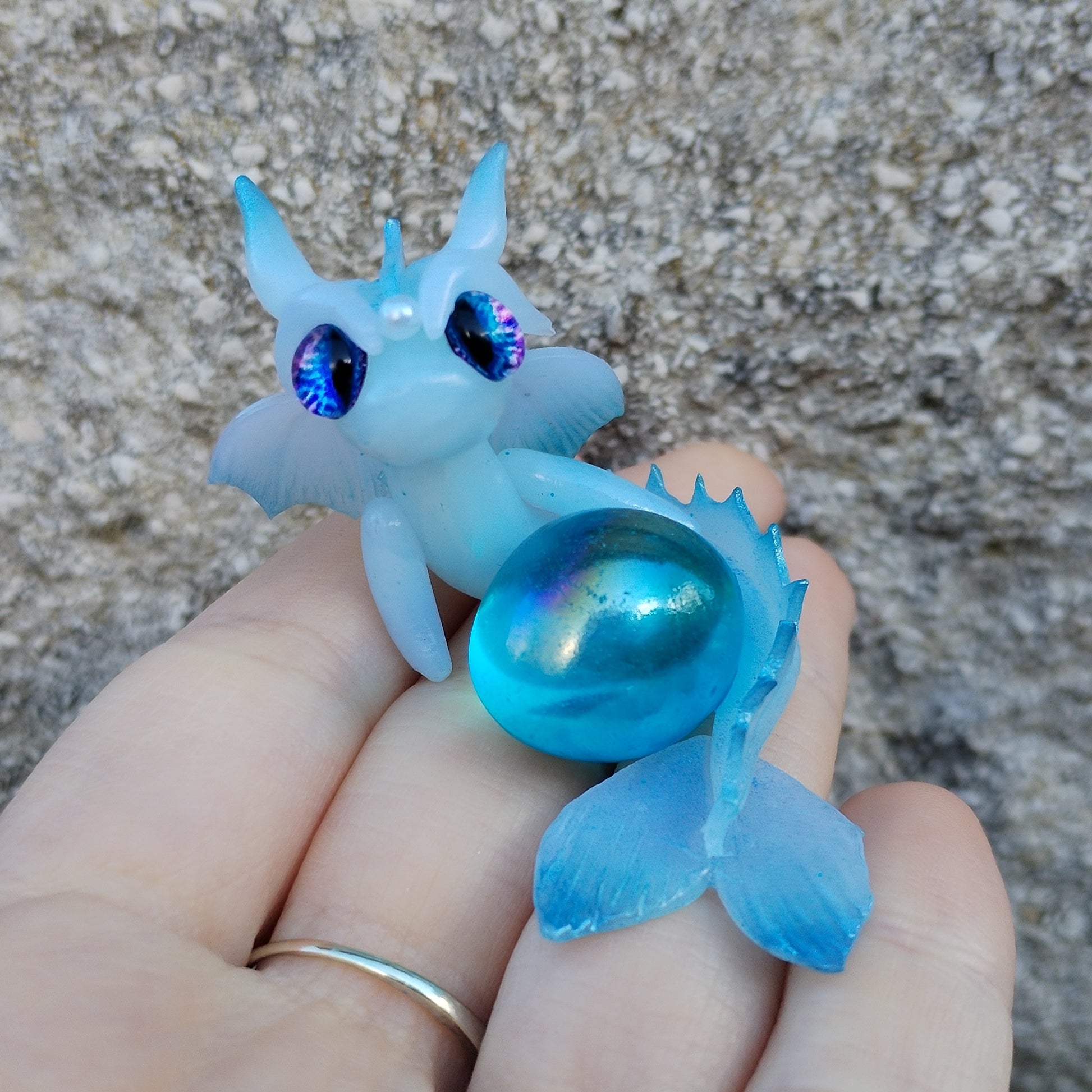 Water inspired baby dragon carefully handmade from polymer clay holding A Blue Aura Quartz piece.