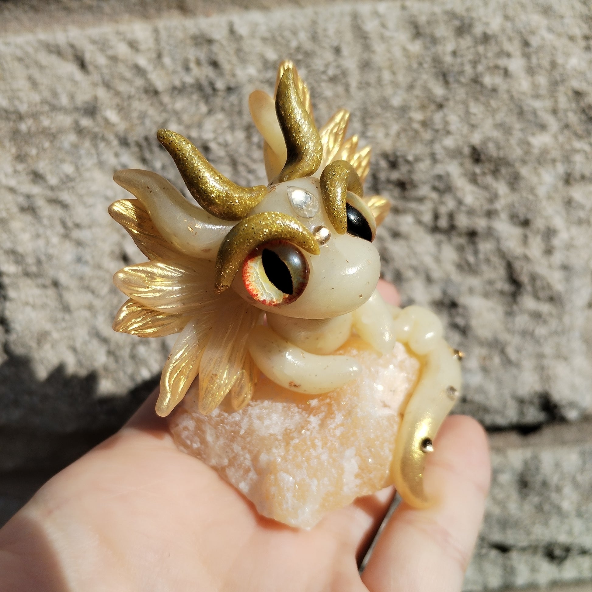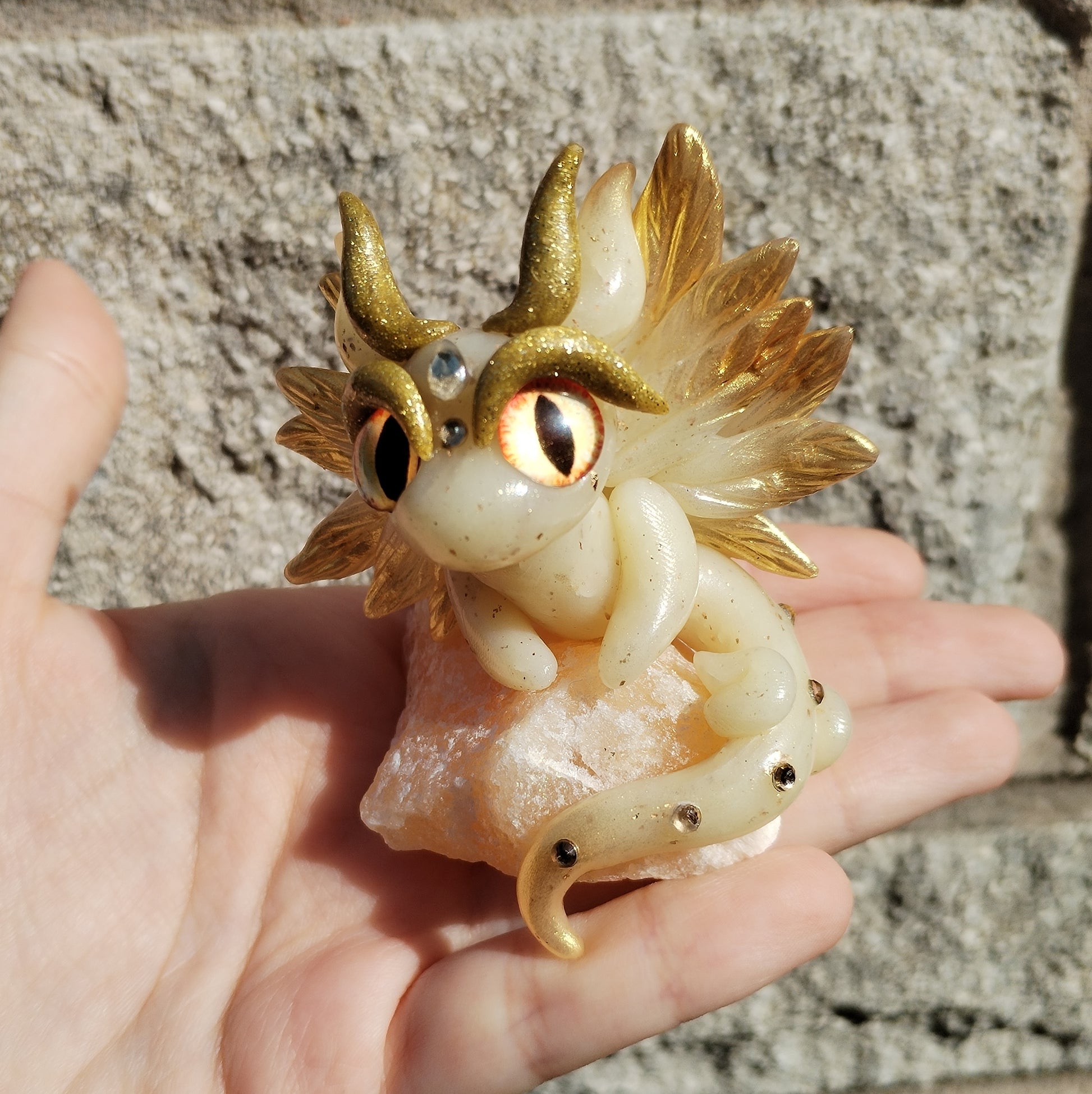 Adorable unique baby dragon carefully handmade from polymer clay holding on top of a Citrine piece.