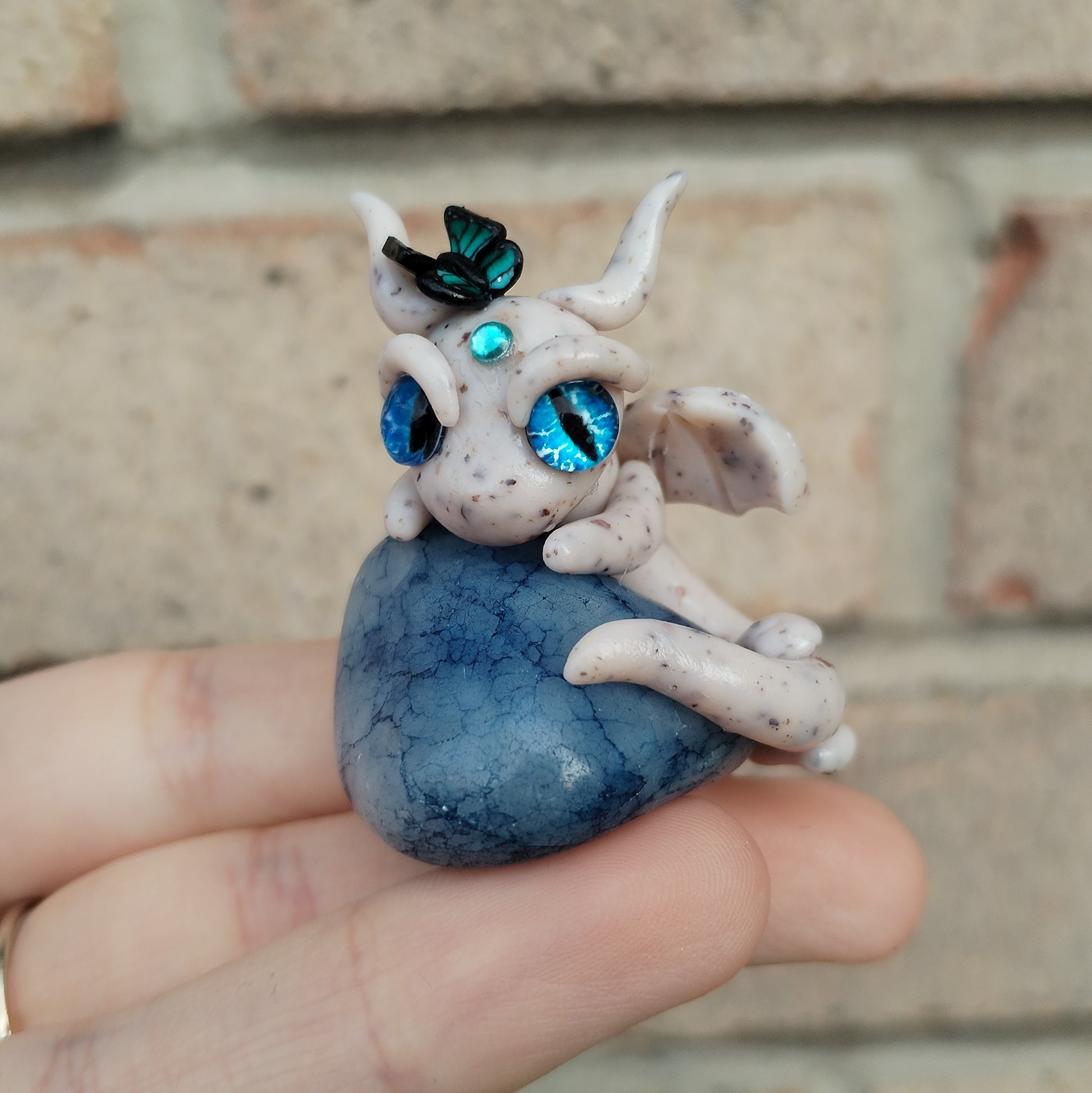 Adorable unique baby dragon carefully handmade from polymer clay sitting on top of a Crackle Quartz piece.