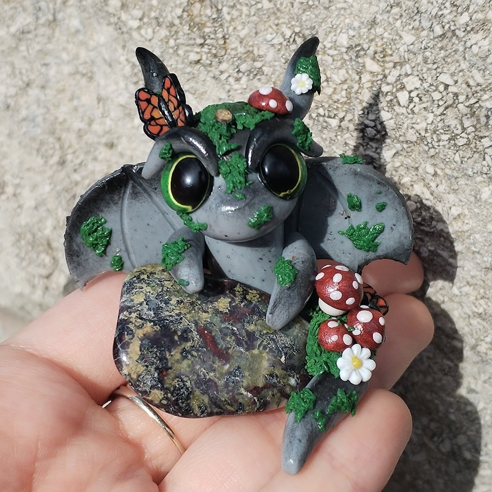 Adorable unique baby dragon carefully handmade from polymer clay holding a Dragon Bloodstone Crystal!