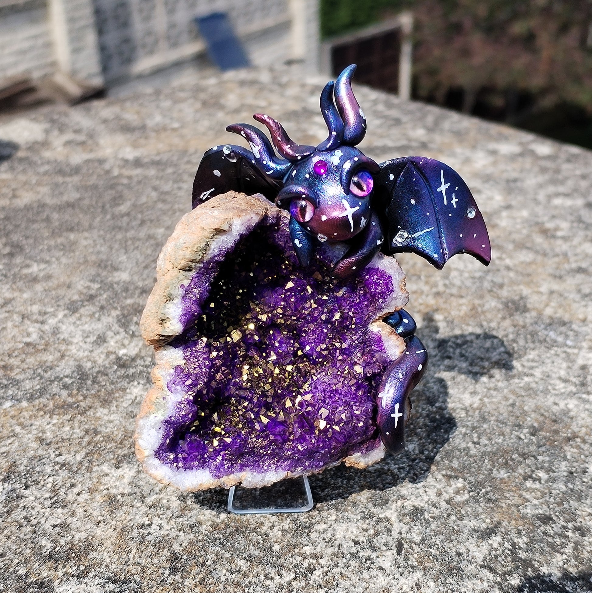 Adorable unique Galaxy themed baby dragon carefully handmade from polymer clay holding onto a Geode Crystal!