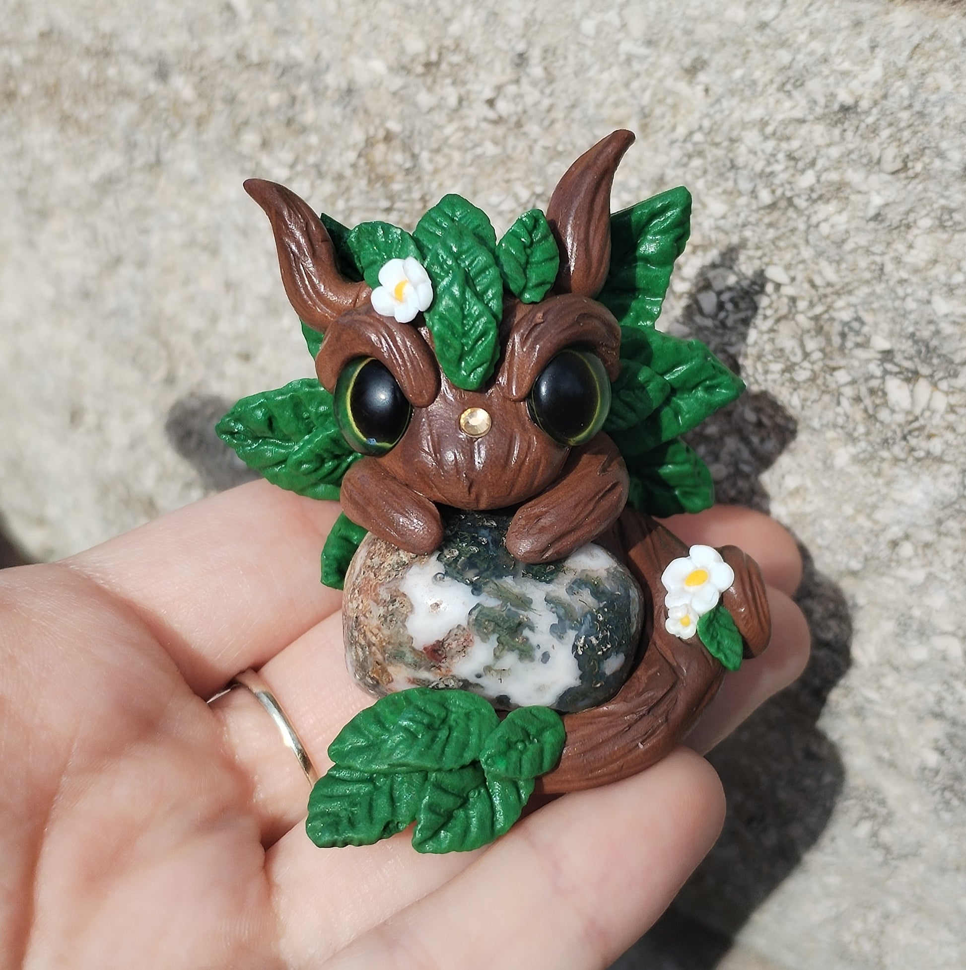 Adorable unique baby dragon carefully handmade from polymer clay holding a Moss Agate Crystal!