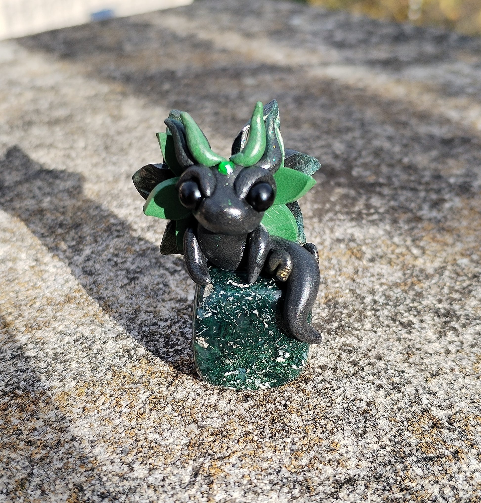 Adorable unique baby dragon carefully handmade from polymer clay sitting on top of a high quality Moss Agate crystal.