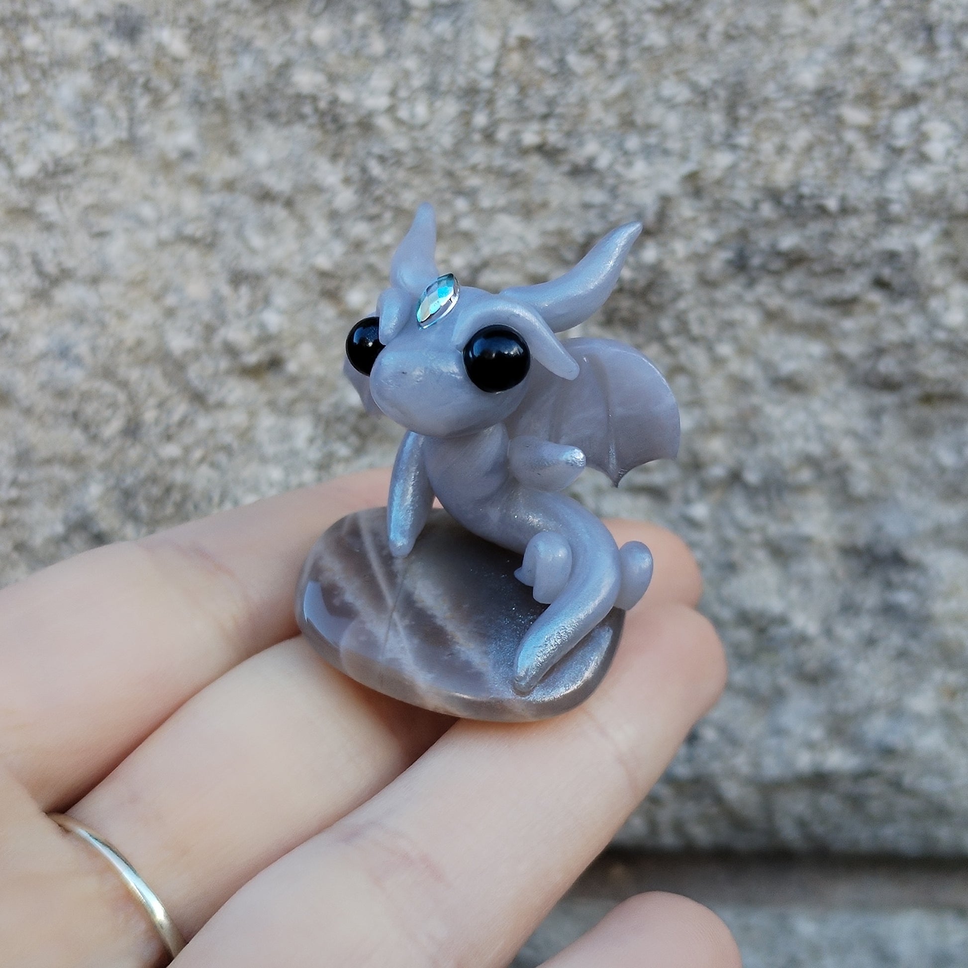 Adorable unique baby dragon carefully handmade from polymer clay sitting on top of a high quality Tourmaline Quartz crystal.